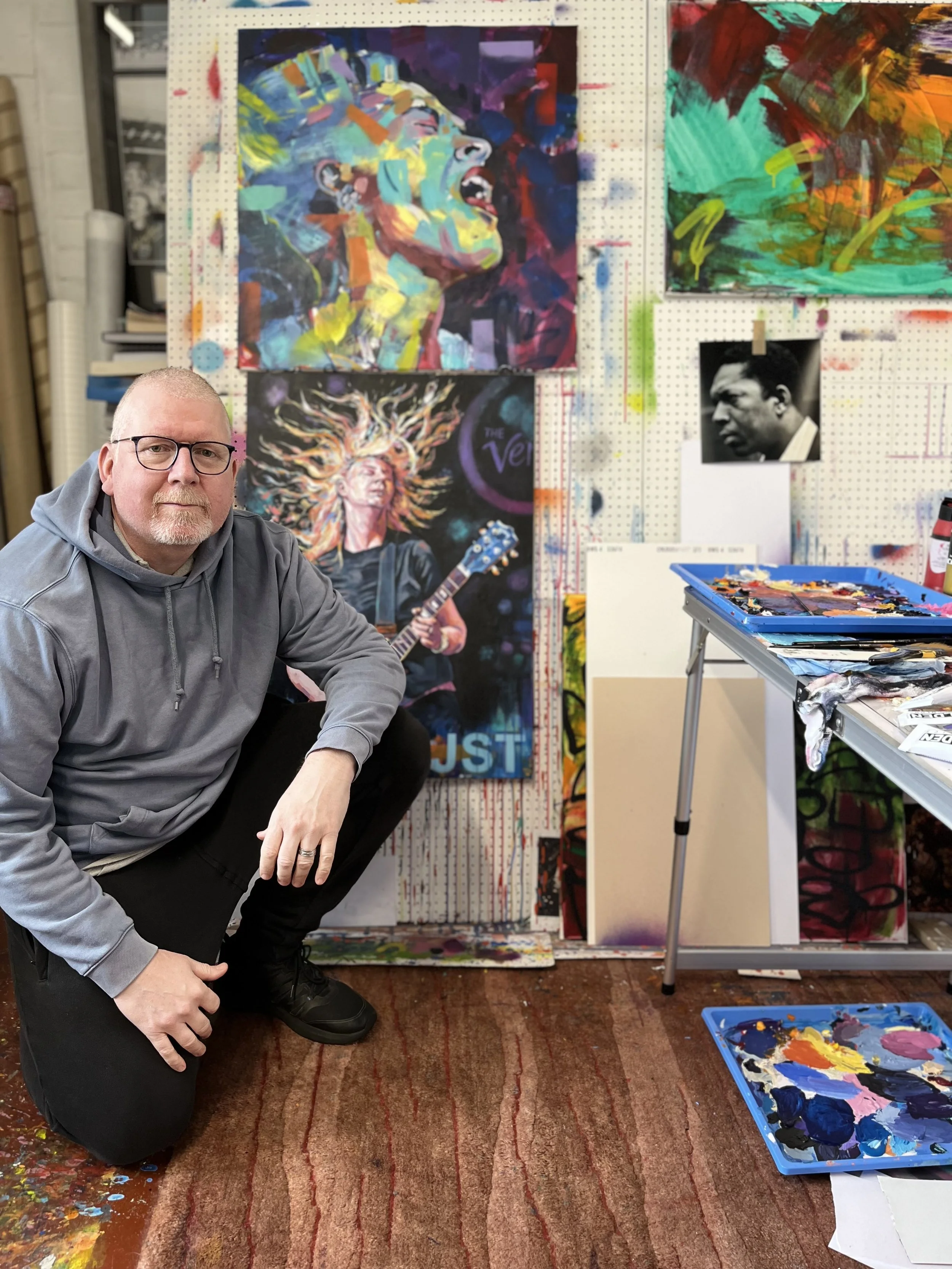 If I am painting a particular musician, I listen to their work for every minute of the painting process and where possible will refer to YouTube videos of live performances which helps project an energy into the marks on the canvas. I also use the live music videos to create quick sketches in colour.